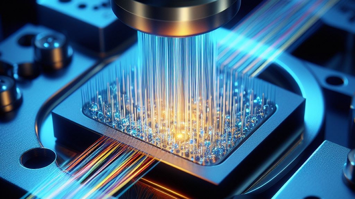 In this Sarcina designed package, fibers come in from right side and were coupled to the lasers on the PIC die underneath. This device allows electronic digital signals to be converted to optical signals and then transmitted to optical fibers by integrated lasers inside the PIC die.