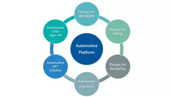 The platform consists of six modules: Design for Autonomous Driving (AD)/ Advanced Driver Assistance System (ADAS), Design for Safety, Design for Test, Design for Reliability, Automotive Chip Sign-off, and Automotive Chip Manufacturing (MFG) Service.